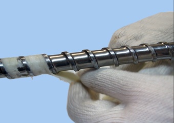 2.) As the screw glides out, the purging product is engineered to peel off the screw like a banana when warm. By design, it has a high affinity to polymers and low affinity to metal. It doesn’t like to stick to metal and releases with ease.